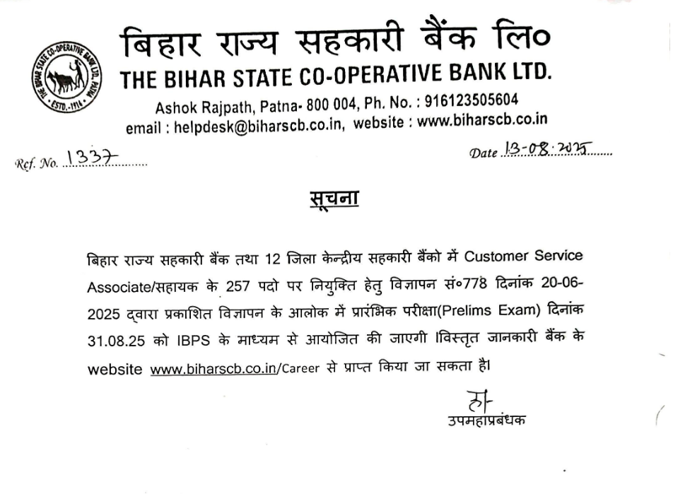 - Age Relaxation as per Bihar BSCB Co-operative Bank Assistant Recruitment Rules.